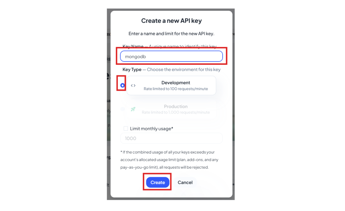 • Give the API Key a name and click on Create.