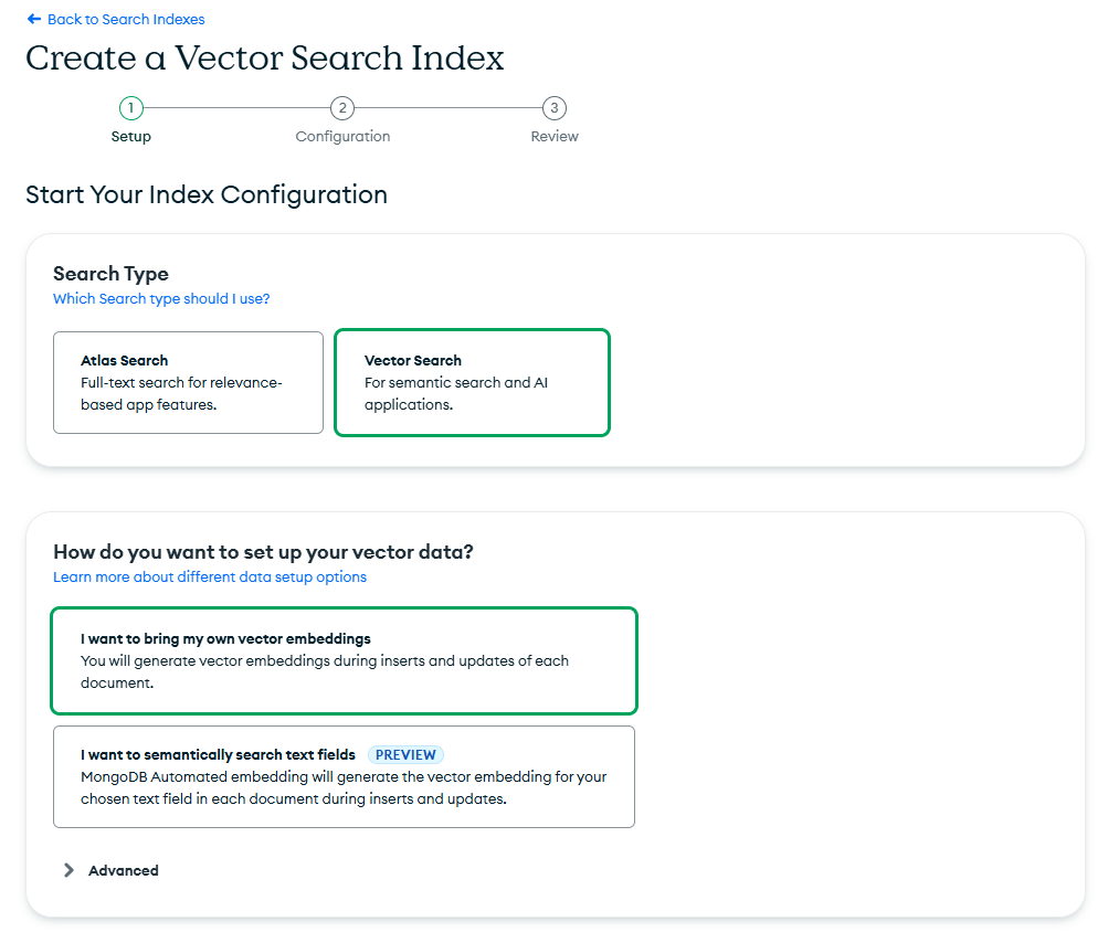 Step 4: In the setup workflow, choose Vector Search as the index type and keep the default option: “I want to bring my own vector embeddings.” Give your index a name—something meaningful that reflects its purpose.