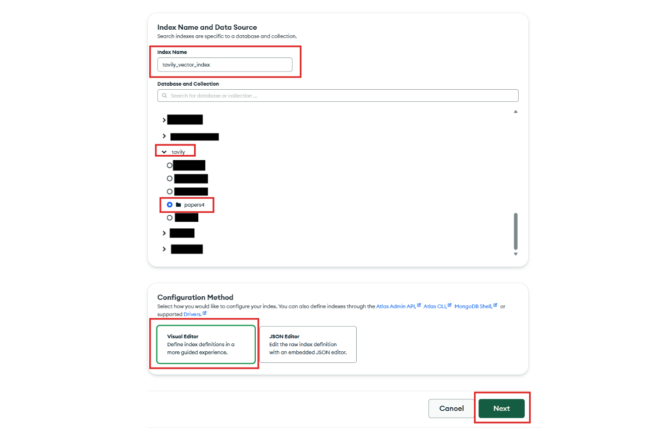 Step 5: Next, select the database and collection that contain the documents with your embeddings. For the configuration method, choose Visual Editor, which makes the setup more intuitive.