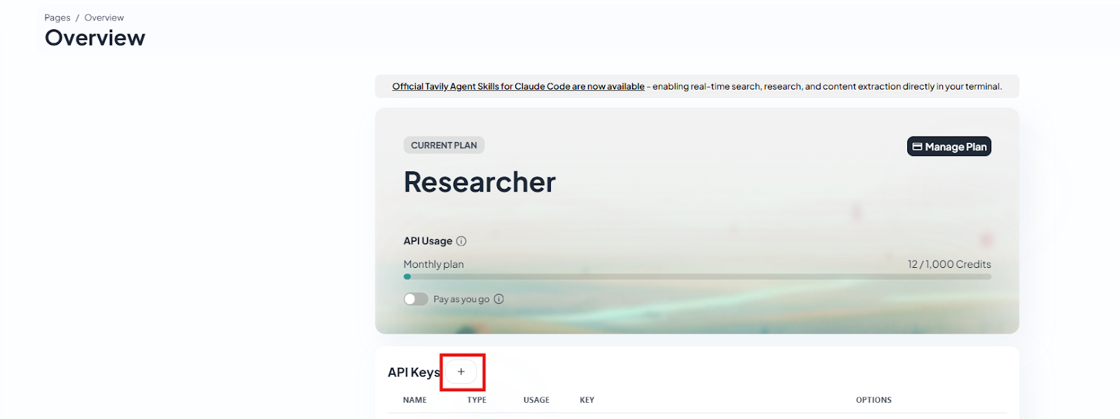 • Once this is done, you get to the Overview page. Here you can see the actual usage and also create API Keys. Now let’s go ahead and click on the plus sign next to the API Keys option.