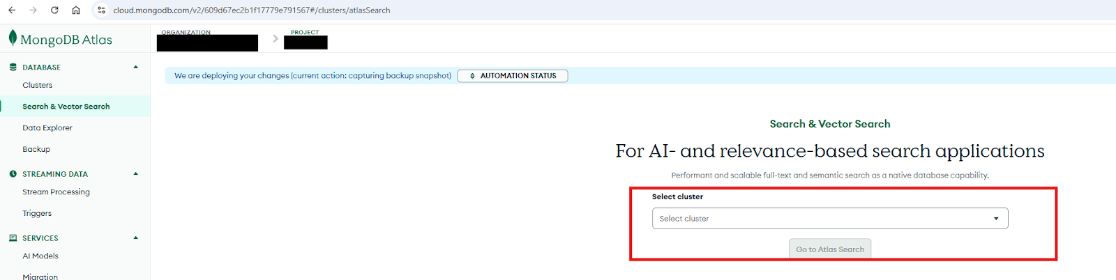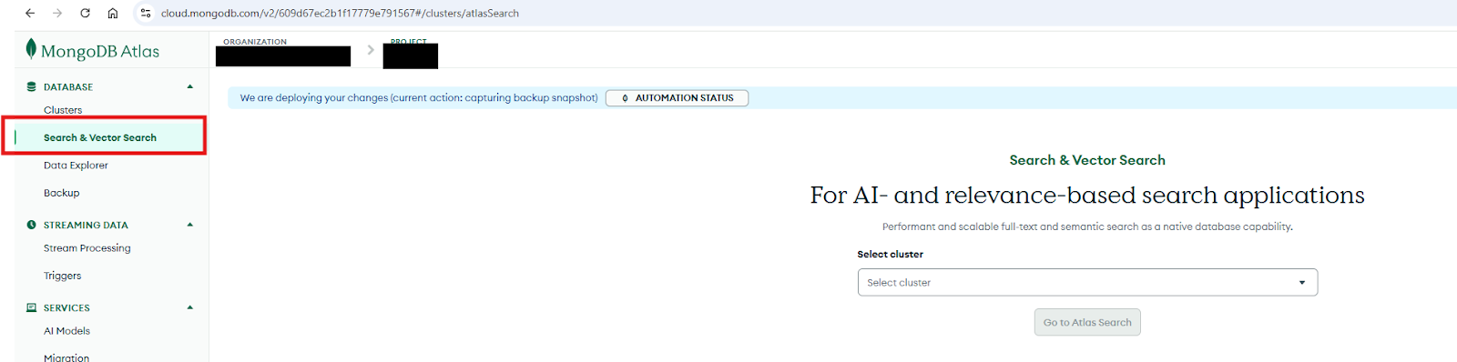 Step 2: In the Select cluster dropdown, choose the cluster where your documents and embeddings are stored, then click Atlas Search.