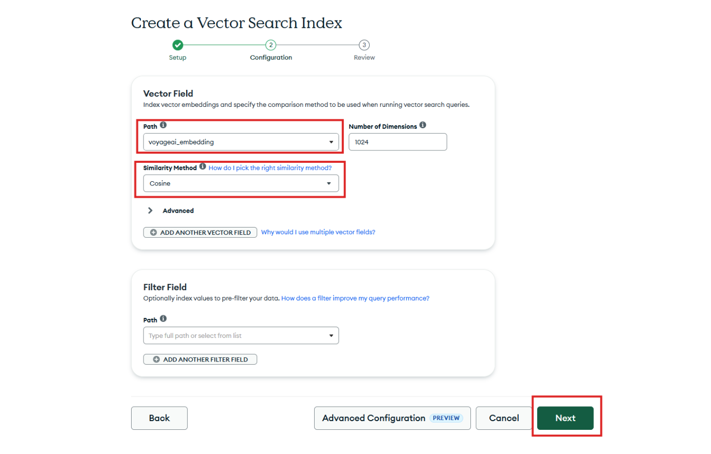 Step 7: Click Next, review the generated configuration, and then select Create Vector Search Index. Once the index finishes building, your hybrid search pipeline is fully ready to support efficient local vector retrieval.