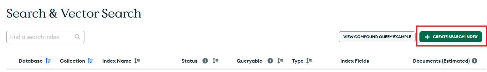 Step 3: You will see a list of existing search and vector indexes. Select Create Search Index on the right.