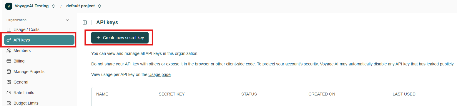 Voyage AI utilizes API keys to monitor usage and manage permissions. To obtain your key, please sign in with your Voyage AI account and click the "Create new secret key" button in the API keys section of the Voyage dashboard.