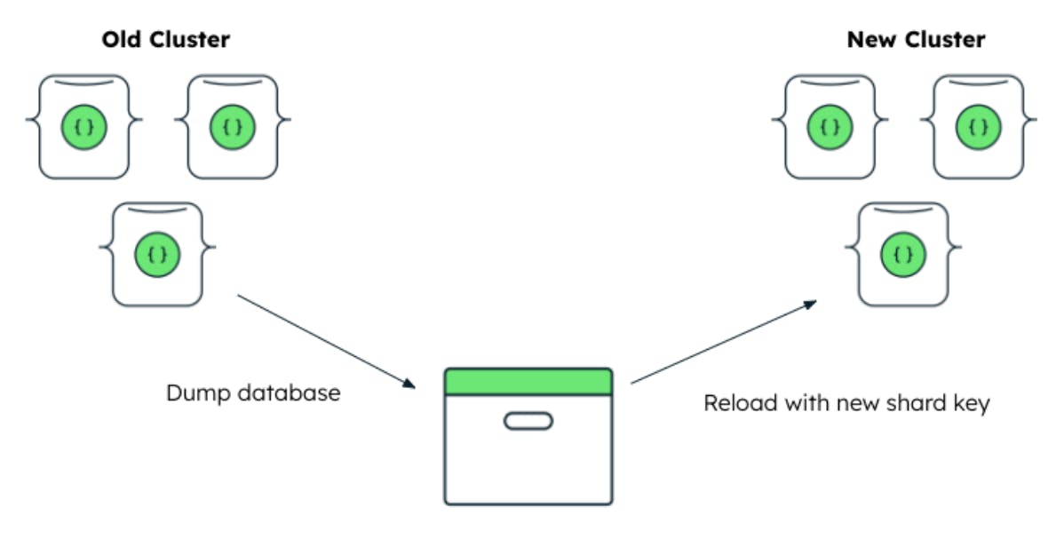 - Dumping the entire collection and then reloading it into a new collection with the new shard key. This is an offline process, and so your application is down until data reloading is complete — for example, it could take several days to dump and reload a 10 TB+ collection on a three-shard cluster.