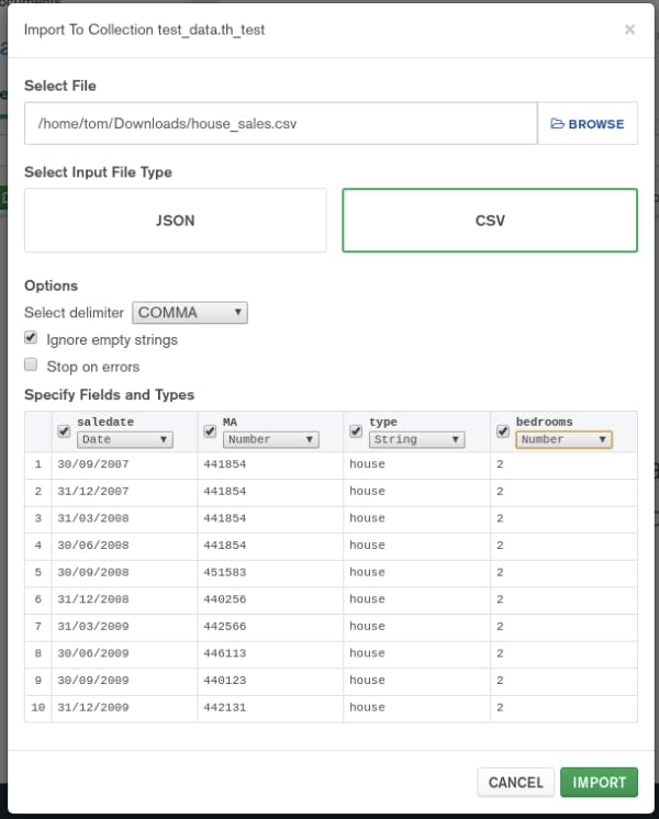 If you would prefer to follow along with this tutorial from your own database, feel free to use your own connection string, and upload an example dataset where you can run a number of test cases house_sales.csv.