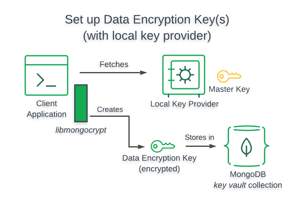 The following diagram describes the architecture of a Queryable Encryption-enabled application using a Local Key Provider.