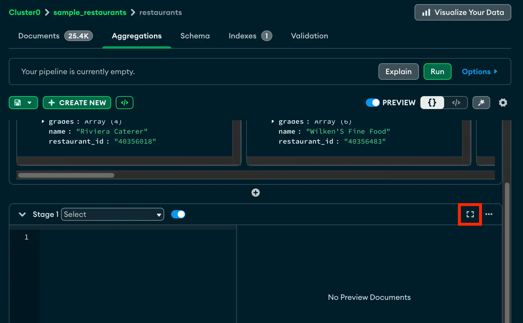 집계 파이프라인 빌드 하려면 컬렉션 선택하고 Aggregations 탭 클릭합니다. Atlas 빈 집계 파이프라인 표시됩니다. Preview of Documents in the Collection 섹션에는 선택한 컬렉션 에서 무작위로 샘플링된 10 문서가 표시됩니다.