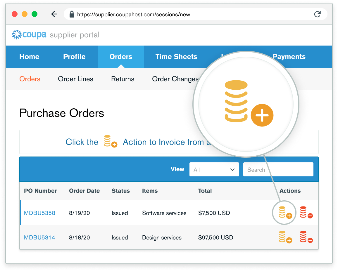 Find the PO you need to invoice against and click on the stack of gold coins to the right or click into the PO.