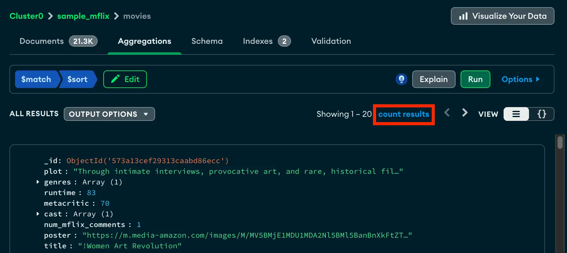 运行管道后,单击Run按钮下显示的count results 。 count results按钮将根据生成的文档计数进行更新。